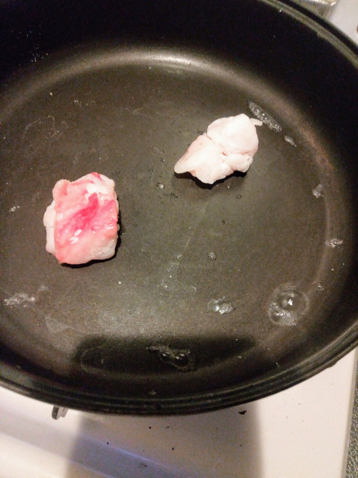 まずはこれまたOKストアでもらってきた(0円)牛脂をフライパンで軽く炒めます。